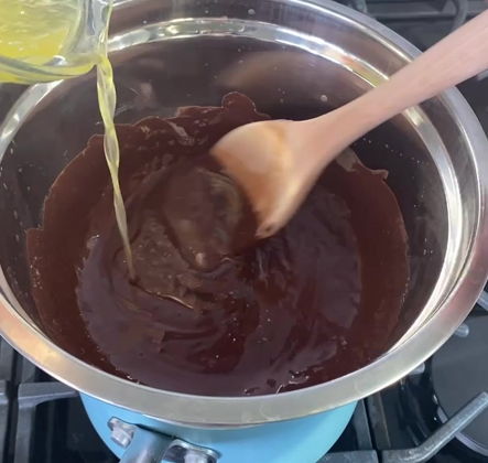 Then add the egg mixture back into the rest of the chocolate mixture and stir.